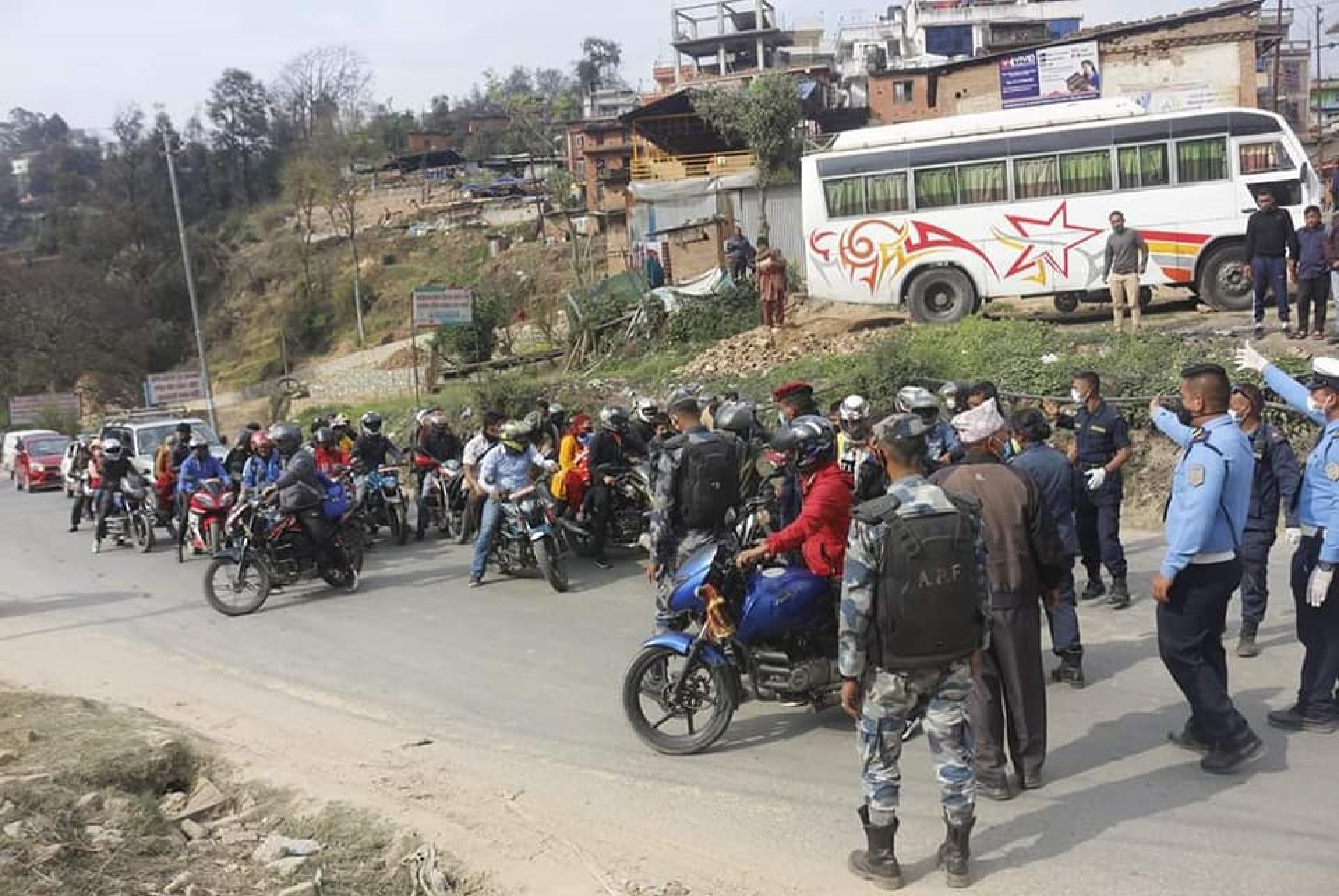 कोरोना भाईरस (कोभिड १९) लाई नियन्त्रण गर्न चैत्र ११ गते देखि आब्हान गरेको ‘लकडाउन’ अटेर गर्ने विभिन्न ब्यक्ति तथा सवारी साधनलाई प्रहरीले नियन्त्रणमा लिई कारवाही शुरु गरेको छ । समाचार तयार पार्दासम्म दर्जनौ सवारी साधनलाई नियन्त्रणमा लिई ब्यक्तिहरुलाई पक्राउ गरेको प्रहरीले जानकारी दिएको छ ।